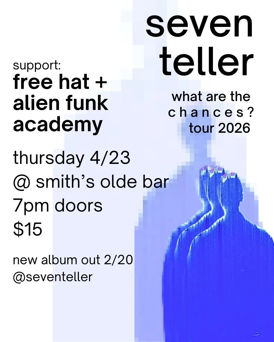 Back to All Events 4/23 - atlanta, ga Thursday, April 23, 2026 7:00 PM 11:59 PM smith's olde bar 1578 Piedmont Avenue Northeast Atlanta, GA, 30324 United States (map) Google Calendar ICS https://smithsoldebar.freshtix.com/events/seven-teller-what-are-the-chances-tour-2026-sobatl